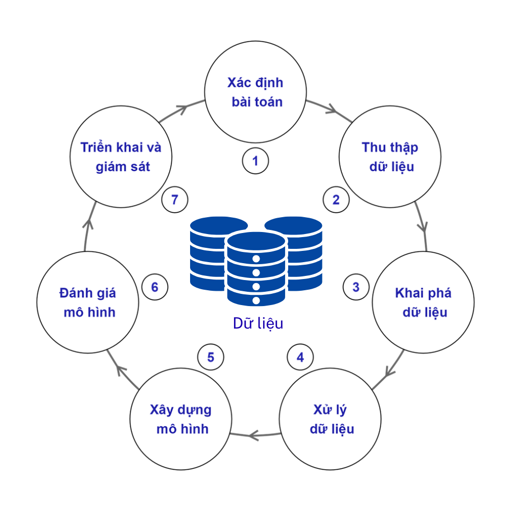 Bước 7: Triển khai và giám sát. Bước cuối cùng là đưa mô hình vào triển khai trong môi trường thực tế như hệ thống phần mềm, ứng dụng web hoặc bảng điều khiển phân tích (dashboard). Sau khi triển khai, cần thiết lập cơ chế giám sát liên tục để theo dõi hiệu suất của mô hình theo thời gian. Trong trường hợp dữ liệu mới xuất hiện hoặc đặc điểm dữ liệu thay đổi, cần cập nhật hoặc tái huấn luyện mô hình để duy trì độ chính xác và tính hiệu quả trong ứng dụng.