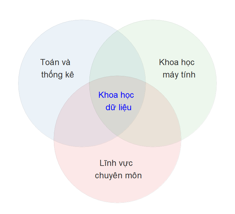 Fig. 1.1 Khoa học dữ liệu là kết hợp giữa Toán - thống kê, Khoa học máy tính, và Kiến thức chuyên môn#